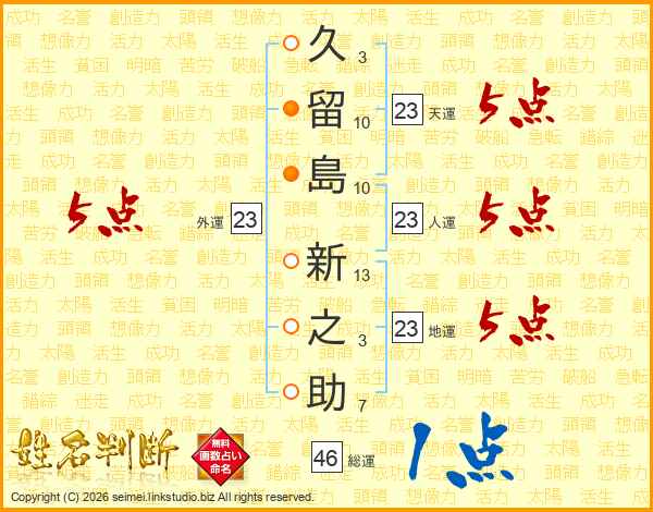 久(3画)留(10画)島(10画) 新(13画)之(3画)助(7画)