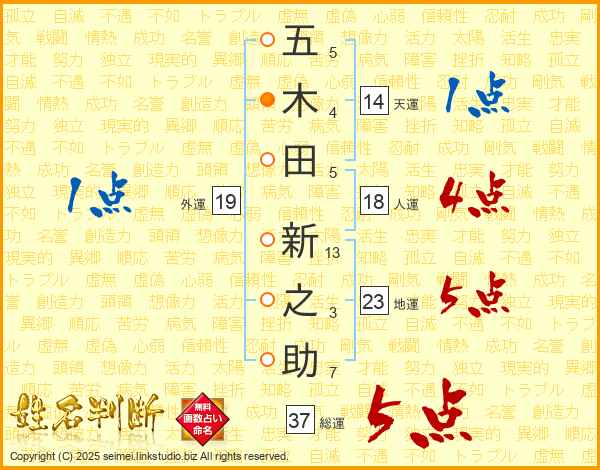 五(5画)木(4画)田(5画) 新(13画)之(3画)助(7画)