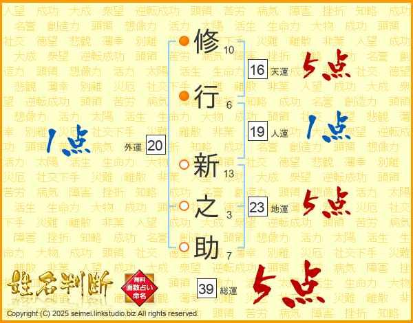 修行新之助さんの総運は39画の5点!