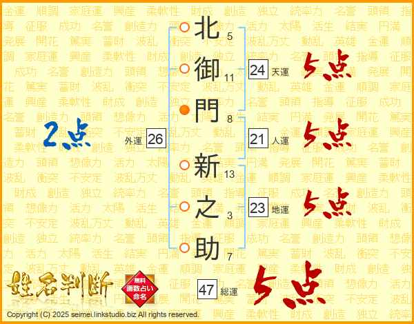 北(5画)御(11画)門(8画) 新(13画)之(3画)助(7画)