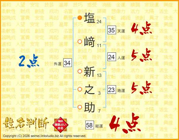 塩(24画)﨑(11画) 新(13画)之(3画)助(7画)