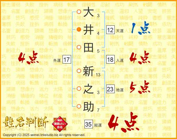 大(3画)井(4画)田(5画) 新(13画)之(3画)助(7画)