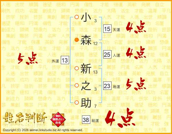 小(3画)森(12画) 新(13画)之(3画)助(7画)