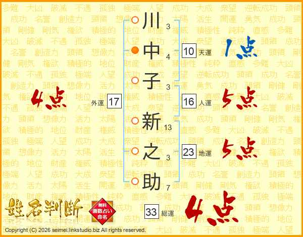 川(3画)中(4画)子(3画) 新(13画)之(3画)助(7画)