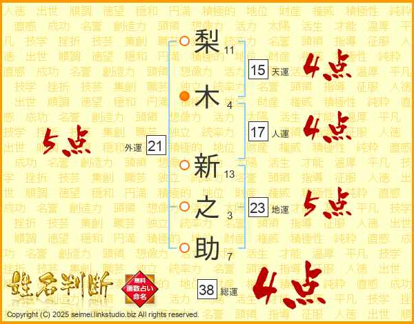 梨(11画)木(4画) 新(13画)之(3画)助(7画)