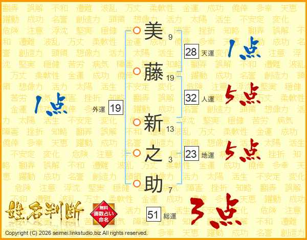 美(9画)藤(19画) 新(13画)之(3画)助(7画)