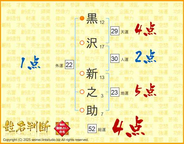 黒(12画)沢(17画) 新(13画)之(3画)助(7画)