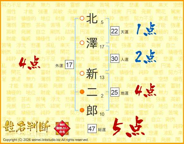 北(5画)澤(17画) 新(13画)二(2画)郎(10画)
