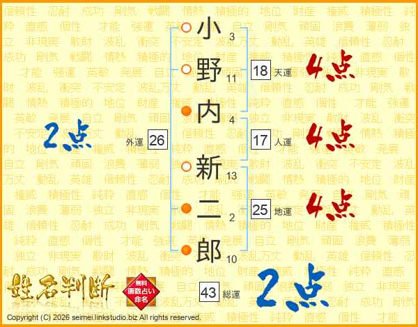 小(3画)野(11画)内(4画) 新(13画)二(2画)郎(10画)