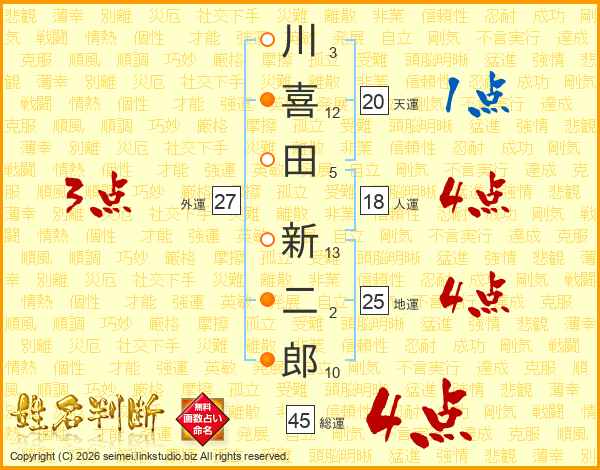 川(3画)喜(12画)田(5画) 新(13画)二(2画)郎(10画)