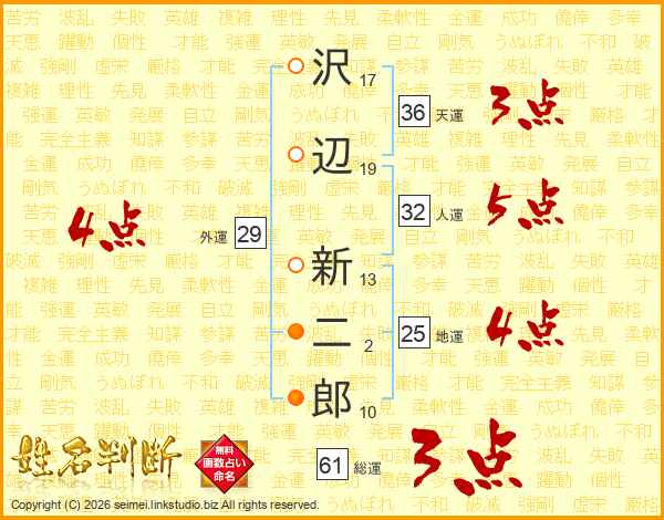 沢(17画)辺(19画) 新(13画)二(2画)郎(10画)