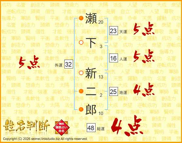 瀬(20画)下(3画) 新(13画)二(2画)郎(10画)