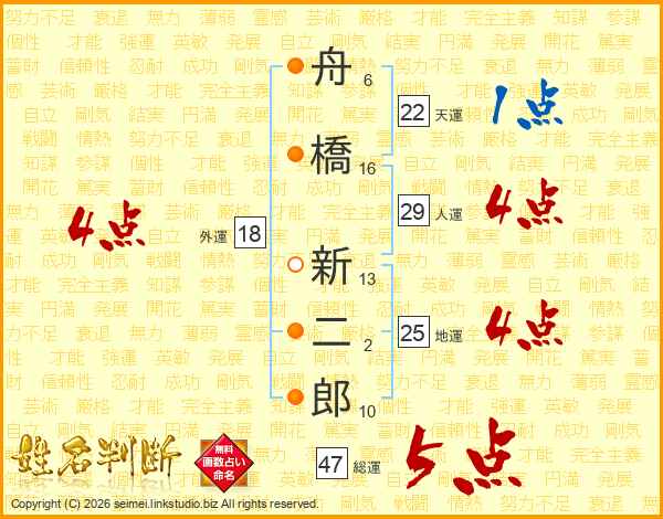 舟(6画)橋(16画) 新(13画)二(2画)郎(10画)