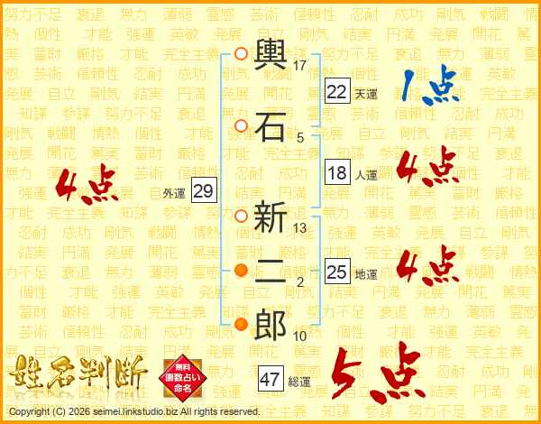 輿(17画)石(5画) 新(13画)二(2画)郎(10画)