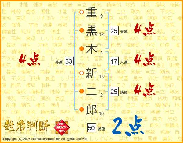 重(9画)黒(12画)木(4画) 新(13画)二(2画)郎(10画)