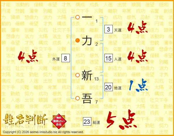 生活面を象徴する運勢です。外部から受ける影響力を表し、結婚運、家庭運や職場、環境への順応性を表します。総運から人運を引いた画数。姓や名が1文字の場合を除く。