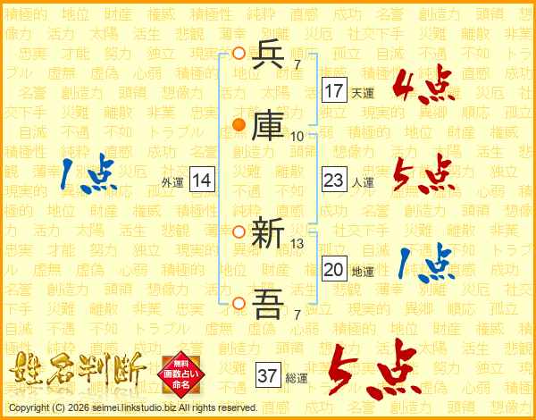 兵(7画)庫(10画) 新(13画)吾(7画)