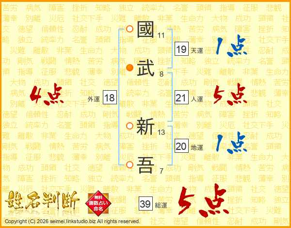 あなたの人生を表す1番重要な運勢です。生涯を通じて影響する総合運となり、主に50歳以降の晩年期に影響を及ぼします。苗字と名前の合計画数。