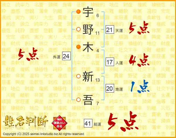 宇野木新吾さんの天運は21画の5点!