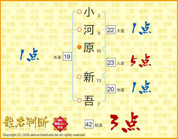 小(3画)河(9画)原(10画) 新(13画)吾(7画)
