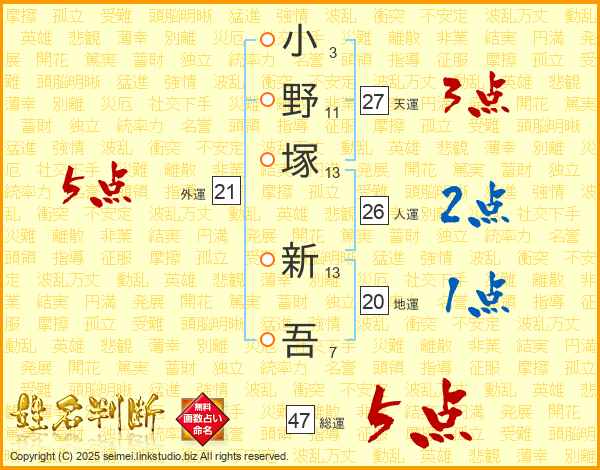 小野塚新吾さんの総運は47画の5点!