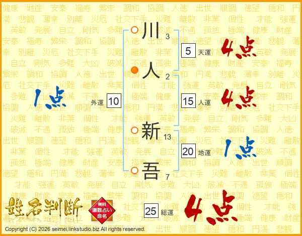 川(3画)人(2画) 新(13画)吾(7画)