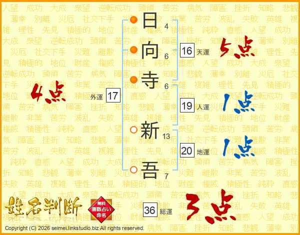 日(4画)向(6画)寺(6画) 新(13画)吾(7画)