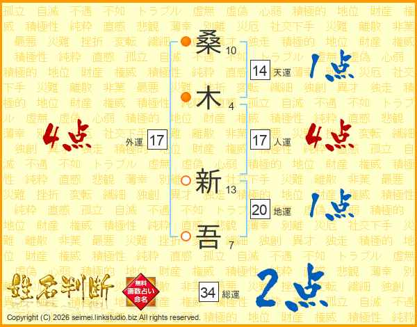 生活面を象徴する運勢です。外部から受ける影響力を表し、結婚運、家庭運や職場、環境への順応性を表します。総運から人運を引いた画数。姓や名が1文字の場合を除く。