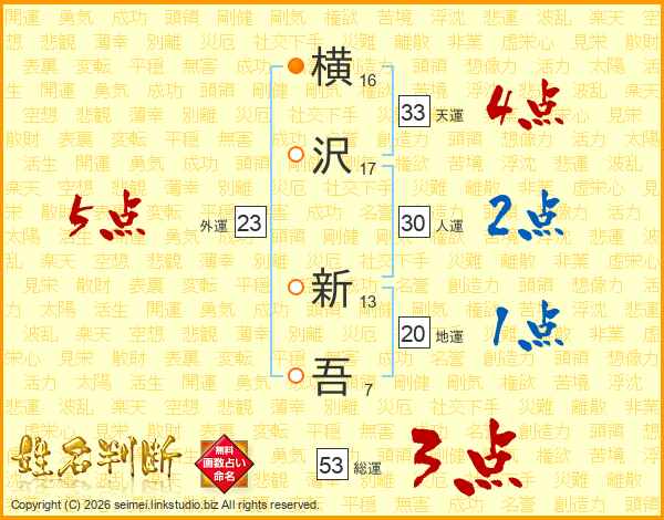 横沢新吾さんの天運は33画の4点!