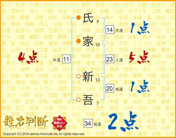 氏(4画)家(10画) 新(13画)吾(7画)