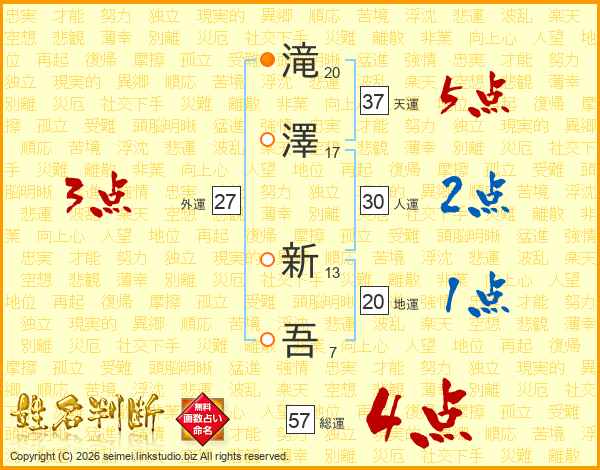 滝(20画)澤(17画) 新(13画)吾(7画)