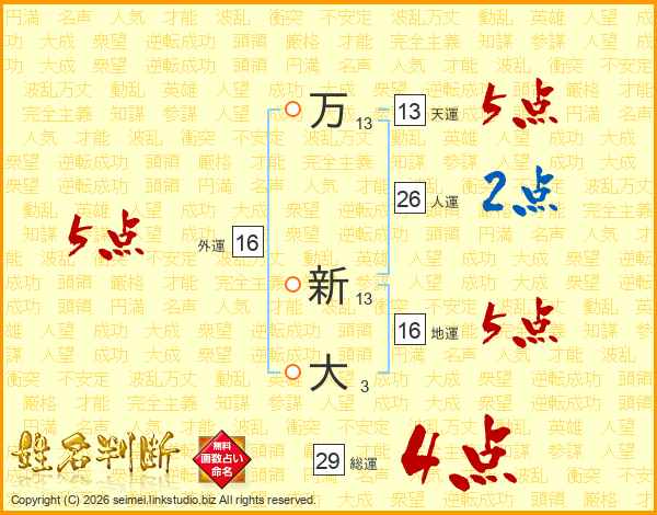 生活面を象徴する運勢です。外部から受ける影響力を表し、結婚運、家庭運や職場、環境への順応性を表します。総運から人運を引いた画数。姓や名が1文字の場合を除く。