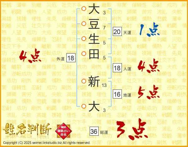 大豆生田新大さんの地運は16画の5点!
