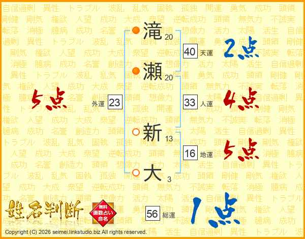 滝(20画)瀬(20画) 新(13画)大(3画)