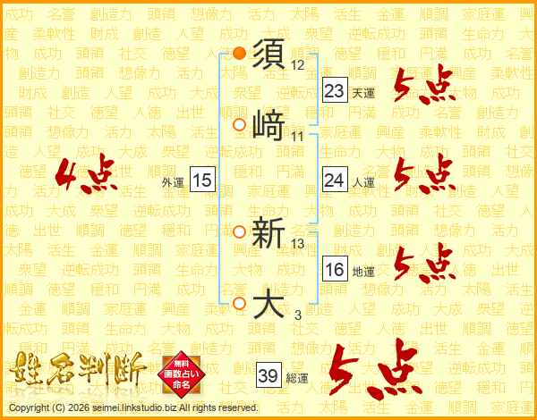 あなたの人生を表す1番重要な運勢です。生涯を通じて影響する総合運となり、主に50歳以降の晩年期に影響を及ぼします。苗字と名前の合計画数。