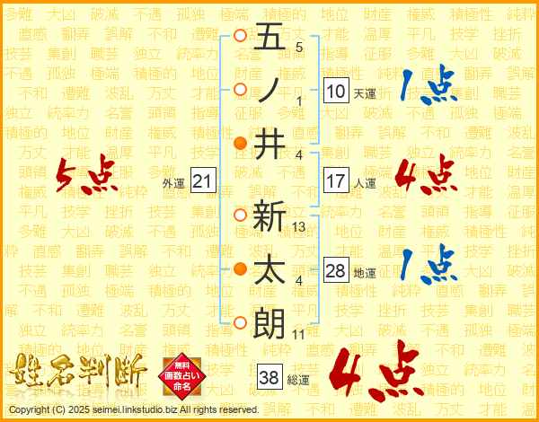 五(5画)ノ(1画)井(4画) 新(13画)太(4画)朗(11画)