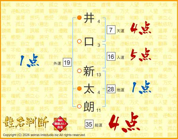 井(4画)口(3画) 新(13画)太(4画)朗(11画)