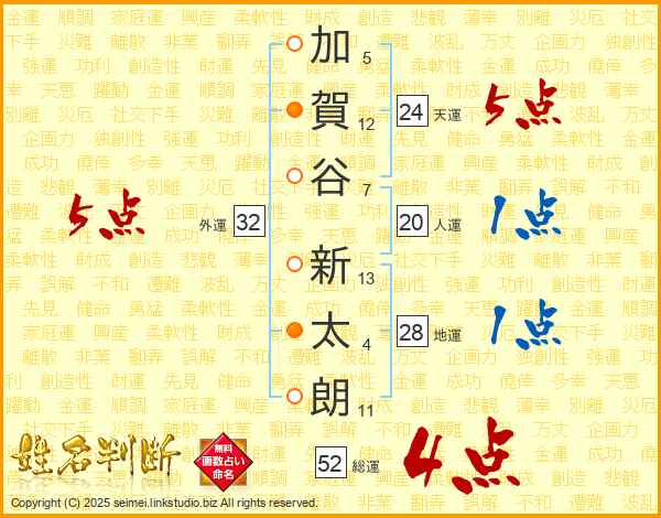 加(5画)賀(12画)谷(7画) 新(13画)太(4画)朗(11画)