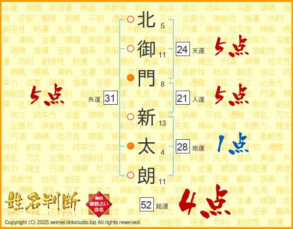 北(5画)御(11画)門(8画) 新(13画)太(4画)朗(11画)
