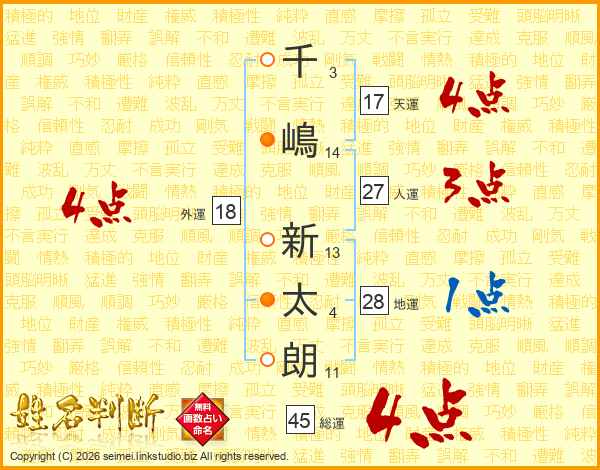 千(3画)嶋(14画) 新(13画)太(4画)朗(11画)