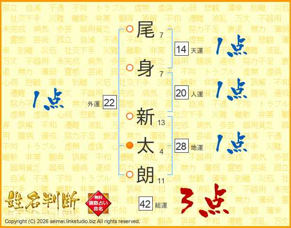 尾(7画)身(7画) 新(13画)太(4画)朗(11画)