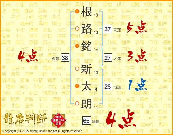 根(10画)路(13画)銘(14画) 新(13画)太(4画)朗(11画)
