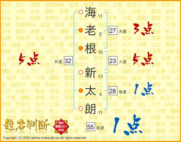 海(11画)老(6画)根(10画) 新(13画)太(4画)朗(11画)