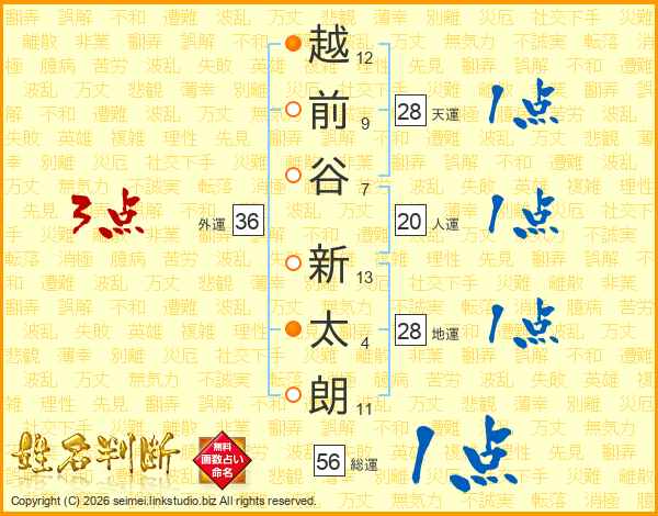越(12画)前(9画)谷(7画) 新(13画)太(4画)朗(11画)