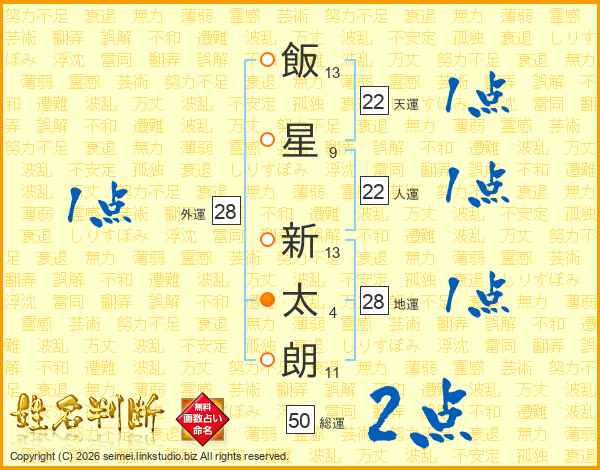 飯(13画)星(9画) 新(13画)太(4画)朗(11画)