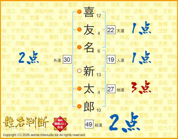 喜(12画)友(4画)名(6画) 新(13画)太(4画)郎(10画)