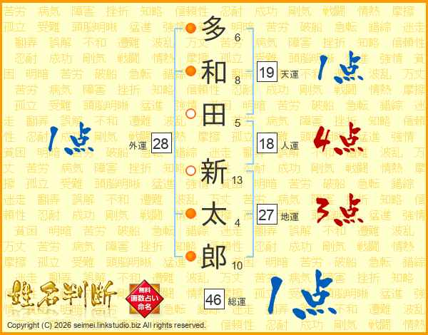 多(6画)和(8画)田(5画) 新(13画)太(4画)郎(10画)