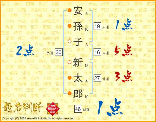 安(6画)孫(10画)子(3画) 新(13画)太(4画)郎(10画)