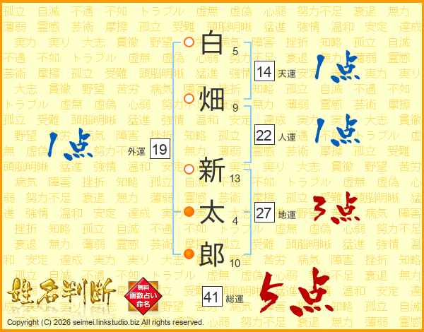 白(5画)畑(9画) 新(13画)太(4画)郎(10画)