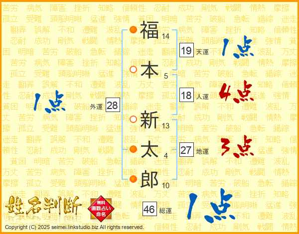 福(14画)本(5画) 新(13画)太(4画)郎(10画)